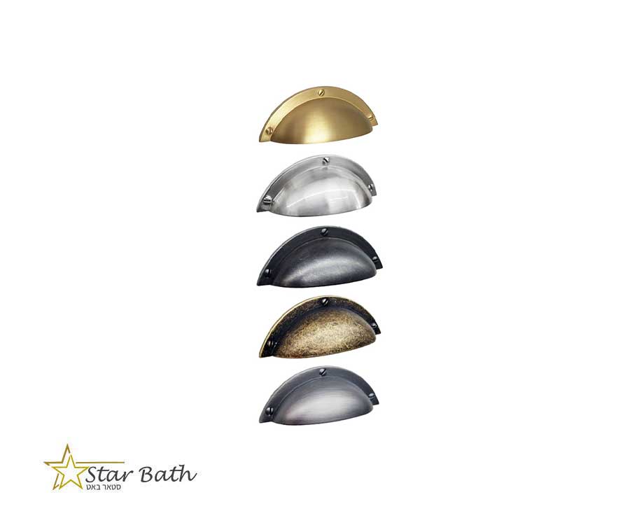 מגוון ידיות קונכיה לארונות ומגירות בגימורים שונים.
